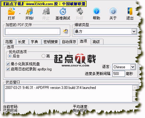 PDF Password Recovery(PDF密码移除) V3.0.48.314 绿色汉化版 Advanced PDF Password Recovery可以Adobe Acrobat PDF文件的“所有者密码”。未“所有者密码”的PDF文件是不能被编辑和打印的。该程序也可以用FileOpen插件加密的文件。可以立即完成。后的文件可以用各种PDF浏览器(例如Adobe Acrobat Reader)阅读而无任何限制。