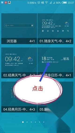 接着在打开的手机小部件列表里,找到需要添加的万年历插件,按照提示,通过拖拽或者点击的方式操作插件。