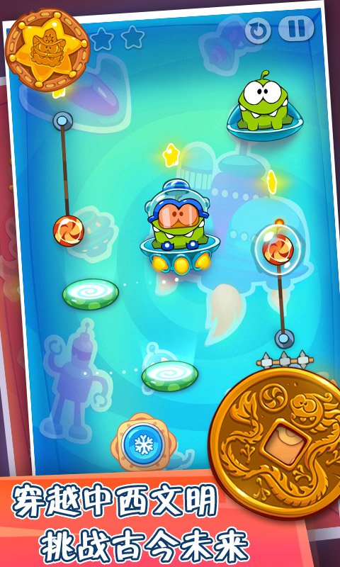 割绳子玩穿越是最新版的《割绳子》物理益智小游戏,割绳子穿越版中的主人公小吃货Om Nom贪吃到了古代去,穿越在古希腊、古罗马等等时代,还是一样的玩法,却有不一样的剧情。