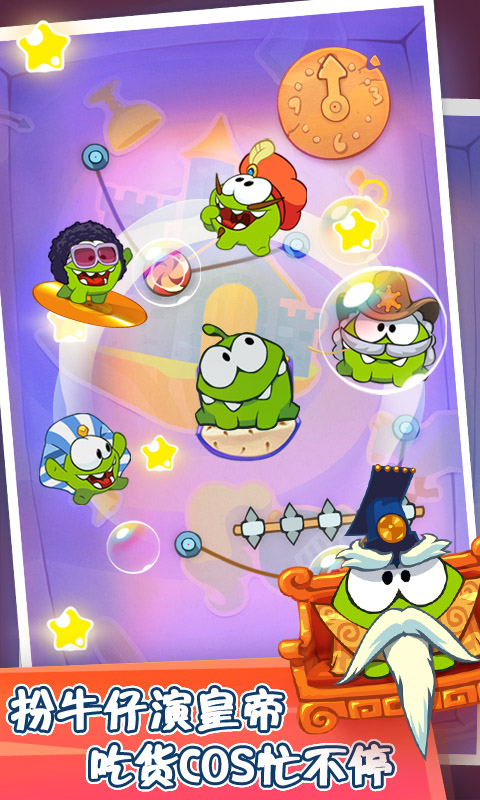 传承经典游戏割绳子但是在这里我们的主人公小吃货Om Nom穿越到石器时代、古埃及、古希腊、中世纪、文艺复兴等时代,在这些不同时代里的装扮不尽相同,十分逗趣可爱。快来看看这只绿色萌气十足的小吃货在搞什么鬼吧,这次它不是一个人在战斗哦,还有它的好朋友陪伴着我们!和它们一起穿越神奇的世界,隐藏着无数秘密等待你去发现!