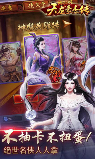 ※顶级写实画面,告别Q版。栩栩如生的侠客形象,华丽炫目的武功特效,诗情画意的战斗场景,给你最丰盛的视觉盛宴,圆你江湖梦※全新第三代卡牌手游玩法,告别传统卡牌。独特三排阵法、超过100项各式创新,让你大呼过瘾。