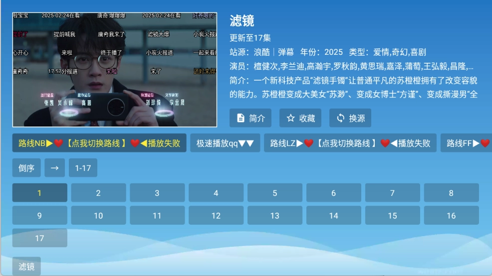 用户点击想看的影片即可播放,还能进行收藏、切换大屏和播放源的操作。