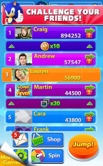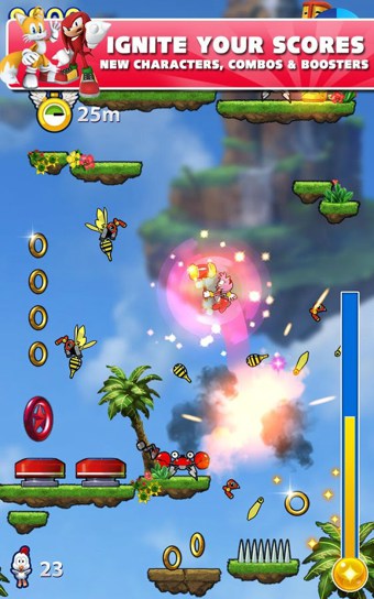 《索尼克跳跃:狂热 Sonic Jump Fever》属于《索尼克跳跃》系列作品,而且从表面看,新作除了几个界面上的变化和前作似乎没什么区别,玩法和整体风格上,都继承了《索尼克跳跃》。两者最大的区别在于新作中你可以和你和小伙伴比拼分数,还有速度加倍的Fever模式,适合快节奏的游戏玩家。游戏采用重力感应控制,玩家需要倾斜设备来控制人物的行动,单击或者双击来控制人物跳跃。为了在限定的时间里面获得更多的分数,玩家可以使用和升级道具,还需要合理的运用不同角色的特性。索尼克跳跃狂热 Sonic Jump Fever修改版:《索尼克跳跃》系列作品,而且从表面看,新作除了几个界面上的变化和前作似乎没什么区别,玩法和整体风格上,都继承了《索尼克跳跃》。两者最大的区别在于新作中你可以和你和小伙伴比拼分数,还有速度加倍的Fever模式,适合快节奏的游戏玩家。