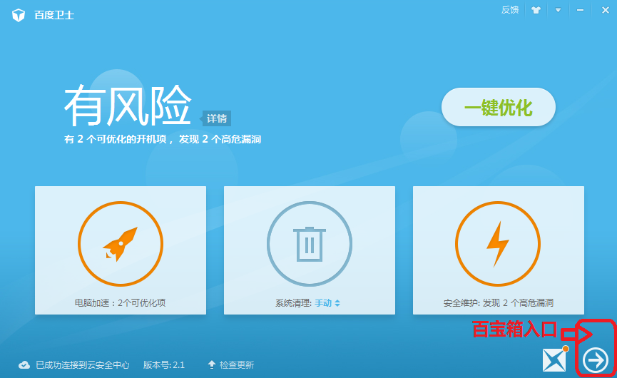 打开百度卫士,点击右下角→箭头进入百宝箱,点击“恶意网址检测”小工具,拖动吸管到你想检测的网站页面,安全状况就显示出来啦~