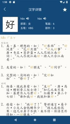 1、能够依据词性的差异开展分级释义,便于用户查阅,而且这里的每个字条都附带了注音、笔画数和部首等信息;
