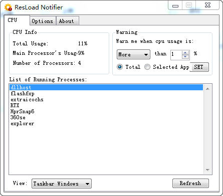 在 ResLoad Notifier 的主界面上有简单的界面,左上角是当前一些 CPU 信息,包括总体的利用率、主要进程利用率以及 CPU 核心数;右侧是设置提示方式,可以设置是大于多少百分比时提示还是小于多少百分百时提示,而且还可以设置是总体利用率还是某个应用程序的利用率;而下方则是显示的是进程,可以选择是当前打开窗口的应用程序还是加上后台的所有进程。
