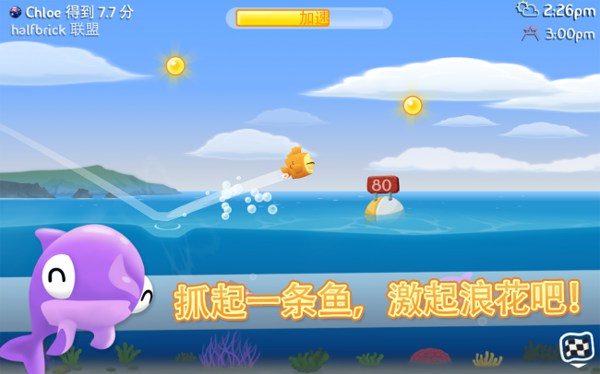 《空中飞鱼 Fish Out Of Water!》是由水果忍者开发商 Halfbrick 开发的的最新作品,一个全新的移动游戏!空中飞鱼讲述的是6只活泼好动的鱼儿渴望在海洋上空飞跃的故事。要帮助这些鱼儿们飞翔,玩家们只需选好鱼儿后将他们从水中投掷向空中,然后看着它们穿越过云朵,欢快得在海浪间跳跃。玩家必须要与种种状况作战,并明智地选择投掷方法,因为天气每隔几分钟都会发生变化。要随时准备好应对任何意外,会有海啸、冰山,甚至还有巨大的水母群!