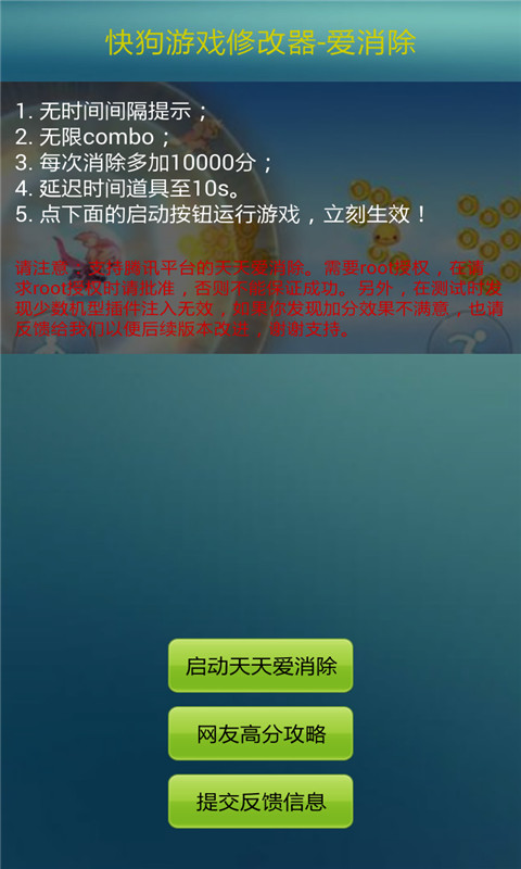 快狗修改器是一款专注于游戏数据修改的辅助工具,快狗游戏修改器爱消除就是非常好用的一款天天爱消除刷分辅助,使用它可以让玩家在《天天爱消除》中每次消除完后都多加10000分,还有各种道具和无限combo等功能。