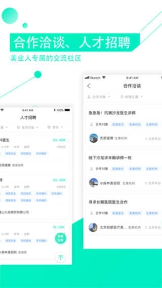 1、美业合作板块:突破地域壁垒,实现跨领域无缝协作,覆盖全球范围内的各类美业机构。支持浏览及发布合作项目,并可实时在线沟通对接;