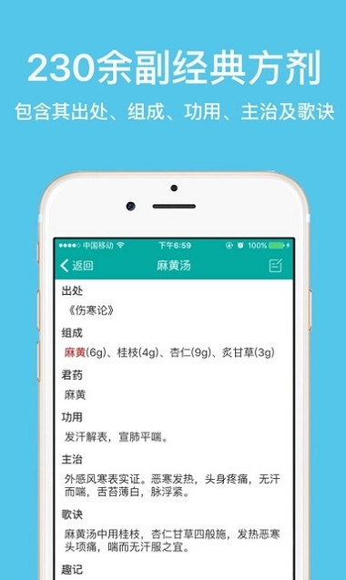 4、众多经典方剂,清晰标注出处、组成、功用、主治等信息,一目了然;
