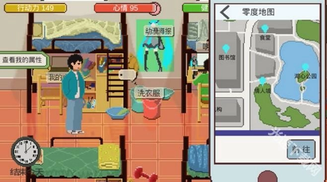 点击右下角的“地图”按钮,打开地图后我们就能离开宿舍,去往学校里的其他场所,像食堂、图书馆、健身房、培训机构、公园、情人坡之类的地方。
