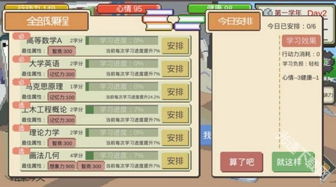 我们每天最多能学习六门课程,但学习压力过大不仅会影响心情、损害健康,而且每门课程都会消耗行动力——这种行动力和体力类似,一旦耗尽,当天就没法再进行其他活动了。所以大家不必每天都把课程排得满满当当,适当放松也是很有必要的。
