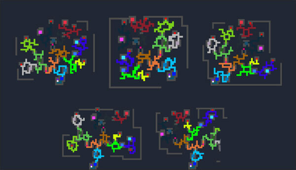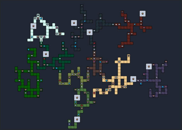 每次开启新局都会重新生成一张整体构造的大地图,大部分格子是野外区域,玩家能在野外打怪获取素材、积累金币,还可以自由穿梭其间。不同颜色对应不同的生物群落,像白色代表雪山,绿色代表丛林,黑色代表洞穴。