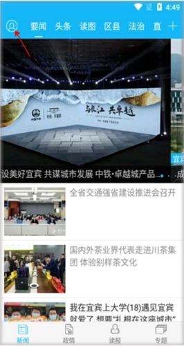 1、打开宜宾日报,登录并进入新闻主页后,用户能够浏览宜宾要闻、综合新闻、法治新闻、直播等内容,随后点击“我的”选项;