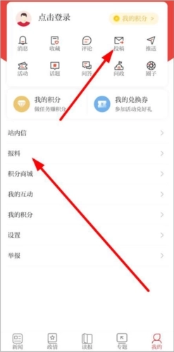 2、在用户中心页面,可查看消息、收藏、评论、活动、话题等内容,随后点击投稿/报料功能键。