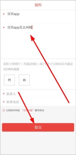 3、进入报料页面后,用户需填写标题、文章内容,上传图片或视频,同时填写联系人姓名与电话,最后点击提交按钮并等待审核即可。
