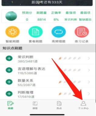 1、在手机上打开“小麦公考”App,进入主界面后,点击右下角的“个人中心”按钮,即可打开个人中心界面。