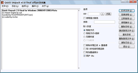 Quick Unpack V2.00 绿色汉化版 Quick Unpack 用以快速脱一些常见的壳,如:UPX, ASPack, FSG, MEW, PE Diminisher, PECompact, PE-PACK, PackMan, WinUPack,等等。本程序尝试绕过所有可能的加密器/混淆器以实现脱壳的目的。