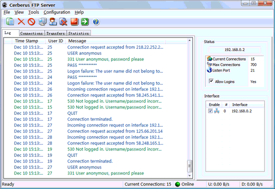 Cerberus FTP Server V2.50 英文绿色特别版 一款FTP服务器软件,提供强大的多线程的FTP而不牺牲易用性。其设计思路在于尽可能少的CPU和内存占用率。特点是有友好的用户界面,可以轻松的隐藏到系统托盘或从中恢复。可监听多个端口,可作为NT服务运行,支持断线续传,提供易用的管理器管理用户权限