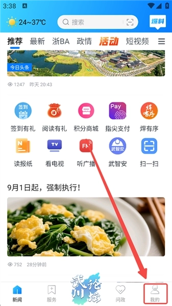 1、在手机上打开掌上武义客户端,点击首页底部的菜单栏【我的】。