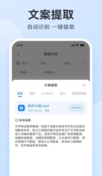 智能文案提取功能:可上传图片或录入语音,系统会自动识别并提取其中的文字信息,便于后续进行编辑和配音操作。