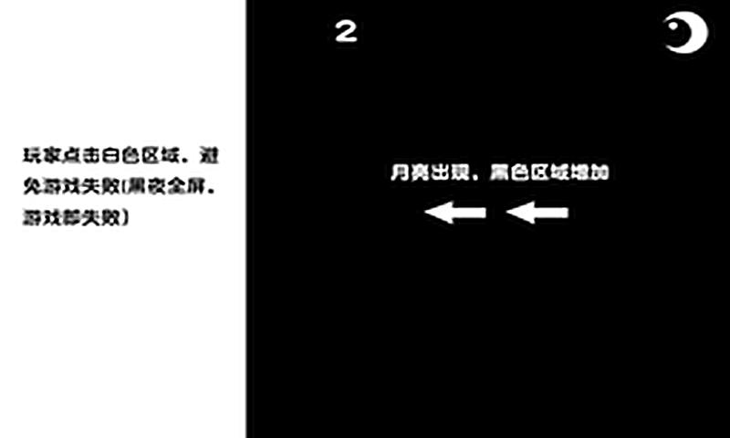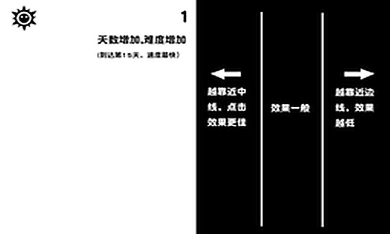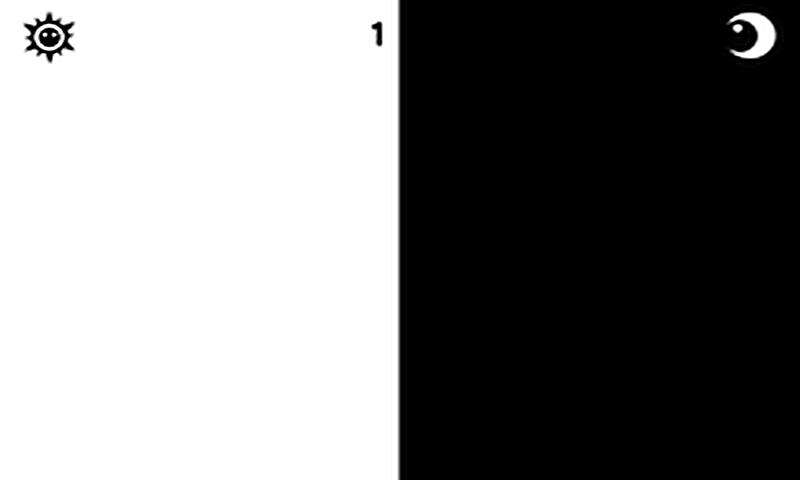 玩家点击相应区域,该区域就会扩大,另一区域则缩小.太阳出现白天到来,白色区域会自动扩大,月亮出现黑夜到来,黑色区域会自动扩大.全屏变白或者变黑即游戏结束.玩家需要适量的点击相对应的区域,避免出现白屏或黑屏,存活下去.每隔几秒白天和黑夜转换一次,随着天数增加,难度也会越来越高.到达第15天,速度最快。