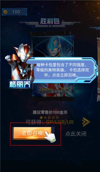 2、每个卡包里都有不同强度和等级的奥特英雄,选好卡包后,点击立即召唤即可。