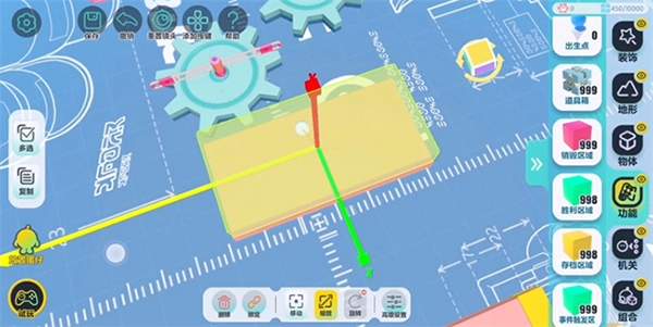 为了操作更便捷,在正式搭建前,要把设置里的编辑视角切换成【上帝视角】。从机关里找到“齿轮”并拖出来,就能完成“齿轮”摆放的基础操作。除了常规摆放,还能点击【旋转】让“齿轮”竖起来,也可以通过调整【缩放】来改变“齿轮”的大小和侧面宽度。等尺寸设置好后,点击左侧的【复制】按钮,就能批量复制已经调整好的组件,这样可以节省时间、提升效率。