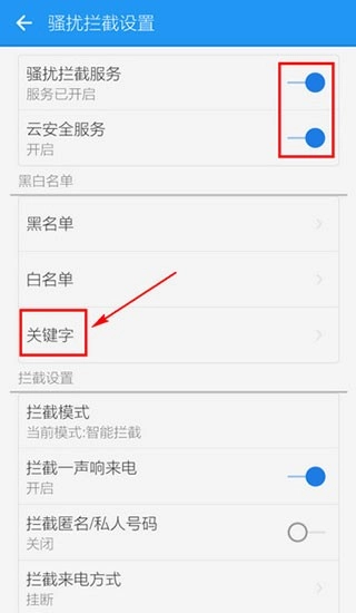 4、打开【骚扰拦截服务】、【云安全服务】后的按钮