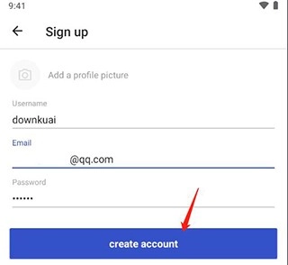 4、填写用户名、邮箱地址和密码,然后点击“create account”按钮完成注册操作。
