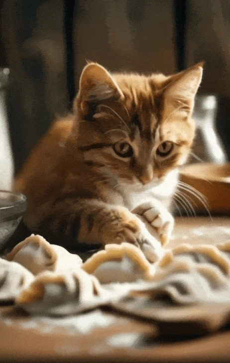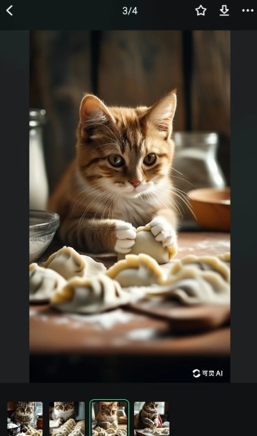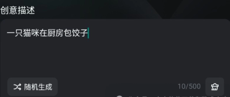 1、在AI图片生成的描述输入框中填写提示词,比如:“一只猫咪在厨房里包饺子”。