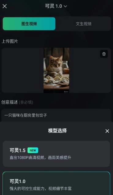 4、回到首页,找到AI视频功能并点击进入,上传刚才保存的图片,输入对应的提示词,接着点击“立即生成”按钮。生成时可以选择5秒或10秒的视频时长,若想缩短生成时间,建议选择可灵1.0模式。