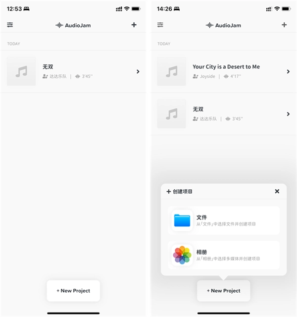 2、第一步是打开App,接着点击「+」按钮创建项目,此时需要从「文件」里导入音频文件,支持的音频格式有.mp3、.m4a、.aac、.aiff、.wav,同时也支持.mp4、.mov格式的视频文件。完成导入操作后,系统会自动将其生成一个工程项目,我们能看到音频文件已成功导入,并且在播放控制界面可以查看对应的波形。
