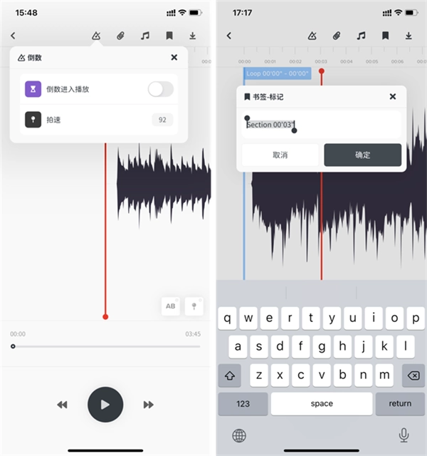 拖动波形来定位播放位置,再设置好音频的起始与结束点,就能开启AB循环播放模式,这对于跟着音乐进行练习很有帮助。
