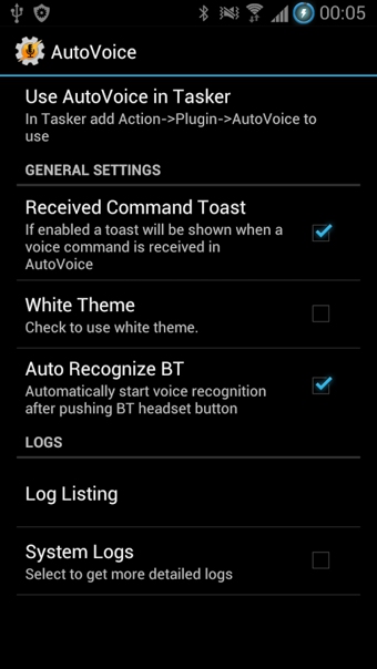 - “AutoVoice控制蓝牙”行动(让你重定向从手机中的所有音频随时蓝牙设备,请注意,蓝牙按钮停止响应,如果这是积极的)