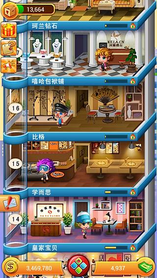 商铺主要的功能就是赚钱维持游戏的正常运营。商铺提供着各种各样的服务,比如教育类、母婴品、婚礼等,可谓是应有尽有,只有你想不到的。当然建造了商铺不代表就可以马上赚大钱了。玩家还需要分配从住宅里招来的人才,根据人才的才能指示合理分配工作,工作的职责主要有三种,即管理、采购和销售。系统会不断地邮件通知,按照邮件的内容通过电梯送达到指定的居民手上就可以获得金币、货物等包裹。