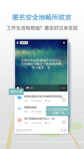 面对自己的朋友,您可以大声说出平常不敢说的话,表达最真实的自我——他们知道是自己的朋友在说话,却不知道您是谁。当然,反过来,您也可以窥探到自己好友发布的劲爆秘密。