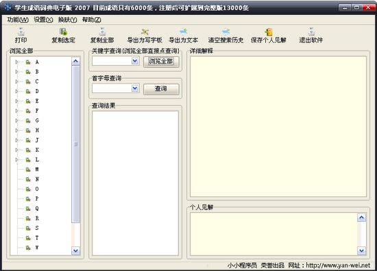 学生成语词典电子版 V2007 绿色特别版 『学生成语词典电子版』可查询常用成语共计13000条,详细解释包括成语的拼音、典故、出处和例子。软件界面美观,操作灵活,查询快速。