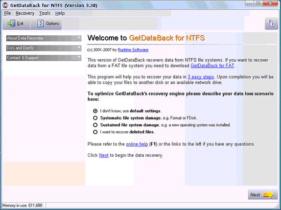 Runtime GetDataBack for NTFS使你从FAT,NTFS文件系统中恢复文件,即使磁盘被格式化、重新分区、中了病毒,或者是因为电源故障、软件原因或人为故意破坏,也照样恢复。还可以从映像文件中恢复文件、创建驱动器映像文件等.