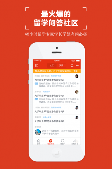 *精选问答社区牛人多:北美TOP30名校学生,国内顶级出国专家(每位都是累计帮助不低于300个学生成功实现出国留学)在线免费指点。*原创全球院校库:应用在手,学长学姐带你逛学校,目标学校的每个角落都不放过。