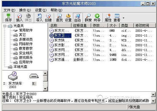 以上功能是大多数虚拟光驱软件都具有的功能,另外,我们还测试了一些《东方光驱魔术师》所具有的特色功能:1、加密虚拟光盘