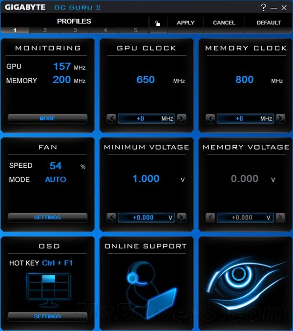 从GTX600开始,OC Guru软件已经全面升级为第二代的OC Guru II,采用全新的设计,参数调教、监控更方便,当前频率、GPU状态以及风扇转速和电压以及功耗控制等信息即时显示,也可以调整核心频率/电压、内存频率/电压、风扇运作模式等,并可直接在线更新驱动程序、BIOS。另外软件可设置五个预设档,用户还能保存自主设定的参数文件,根据需要随时加载调用。有了它,超频只是轻击鼠标左键的事儿。目前OC Guru II支持nvidia GeForce 200/400/500/600系列显卡和AMD(ATI)Radeon HD 5000-7000系列显卡,系统方面则支持WinXP/Vista/Win7/Win8 32/64位系统。