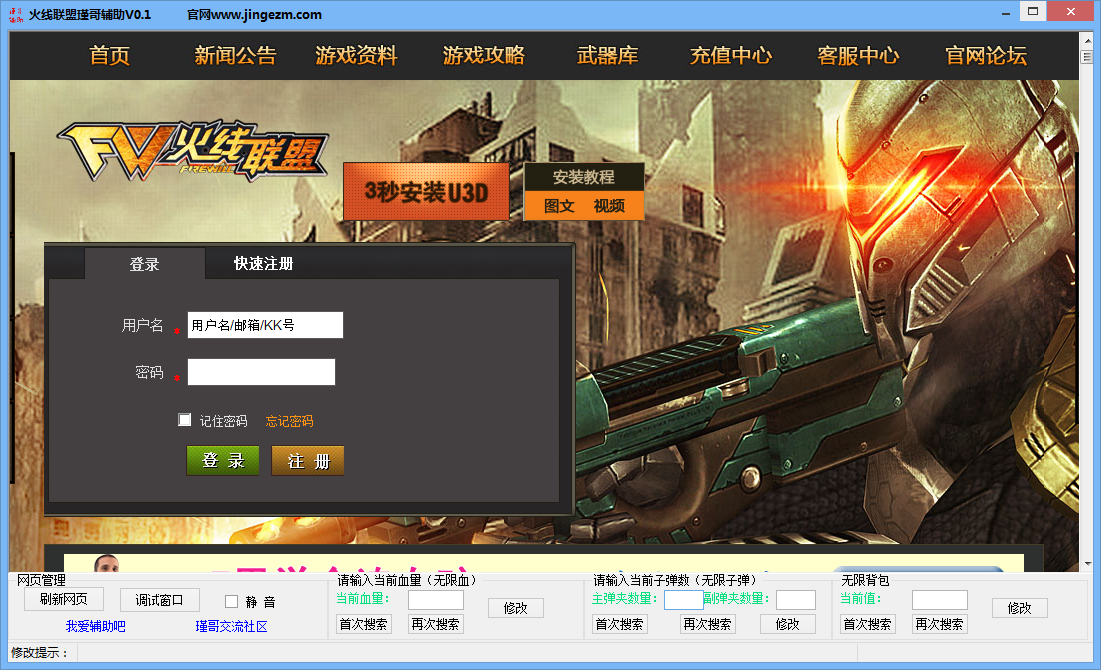 瑾哥火线联盟辅助是页游《火线联盟》的一款三项功能辅助工具,此款火线联盟修改器提供无限子弹、无限血和无限背包辅助,绿色免费安全,为玩家带去很多帮助。