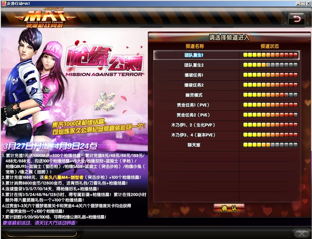 在服务器选择界面选择合适的频道,就在本界面中您可以鼠标左键单击选择一个合适的频道,按下“确定”按钮进入下一步,也可直接鼠标左键双击一个可进入的频道,直接进入下一步。如下图: