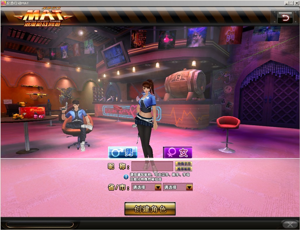 如果您是第一次进入本游戏,登录后会进入角色创建页面,您只可以创建一个角色,角色建立后不可删除。首先,在屏幕右上方姓名栏中输入你喜欢的角色名,再选择您需要创建角色的性别,之后选择您所在的地域信息,创建角色完成后您将免费获得一套屏幕左方模特儿所穿的军装。如下图:登录服务器选择