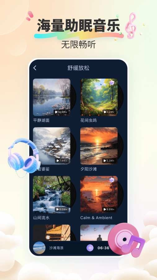 2、专业助眠白噪音、专业ASMR、神奇脑波与放松旋律,助力解决睡眠困扰。