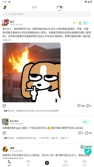 2、接着在广场里还能查看用户发布的动态,并且也可以对帖子进行点赞和评论。