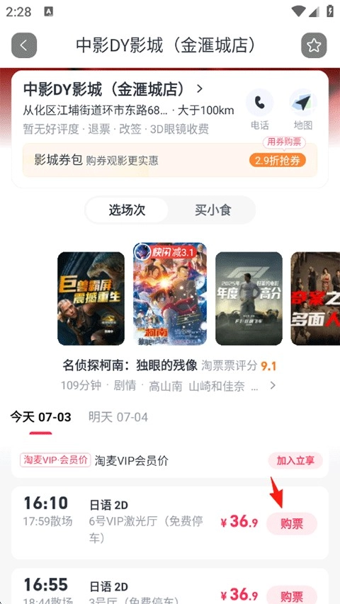 3、进入详情页后,选择观看的时间、地点、版本以及影城名称等信息;