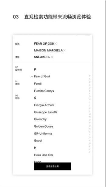 【选购】:在男装与女装分类中,可借助设计师品牌、款式、价格区间及分类等筛选标签,开展个性化的商品搜索。