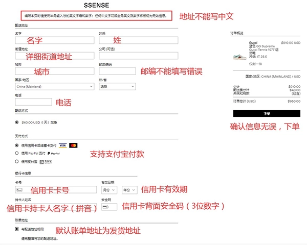4、请填写收货地址,地址需使用英文或拼音填写,中文信息无法被识别;另外大促期间会收取40美元运费,地址填写方式可参考:海淘直邮地址填写攻略。